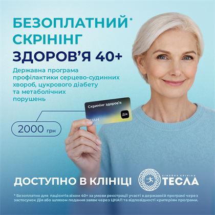 Медичний центр «Тесла» офіційно долучився до державної ініціативи «Національний скринінг здоровʼя 40+», спрямованої на раннє виявлення серцево-судинних захворювань, цукрового діабету 2 типу та порушень психоемоційного стану у людей віком від 40 років.